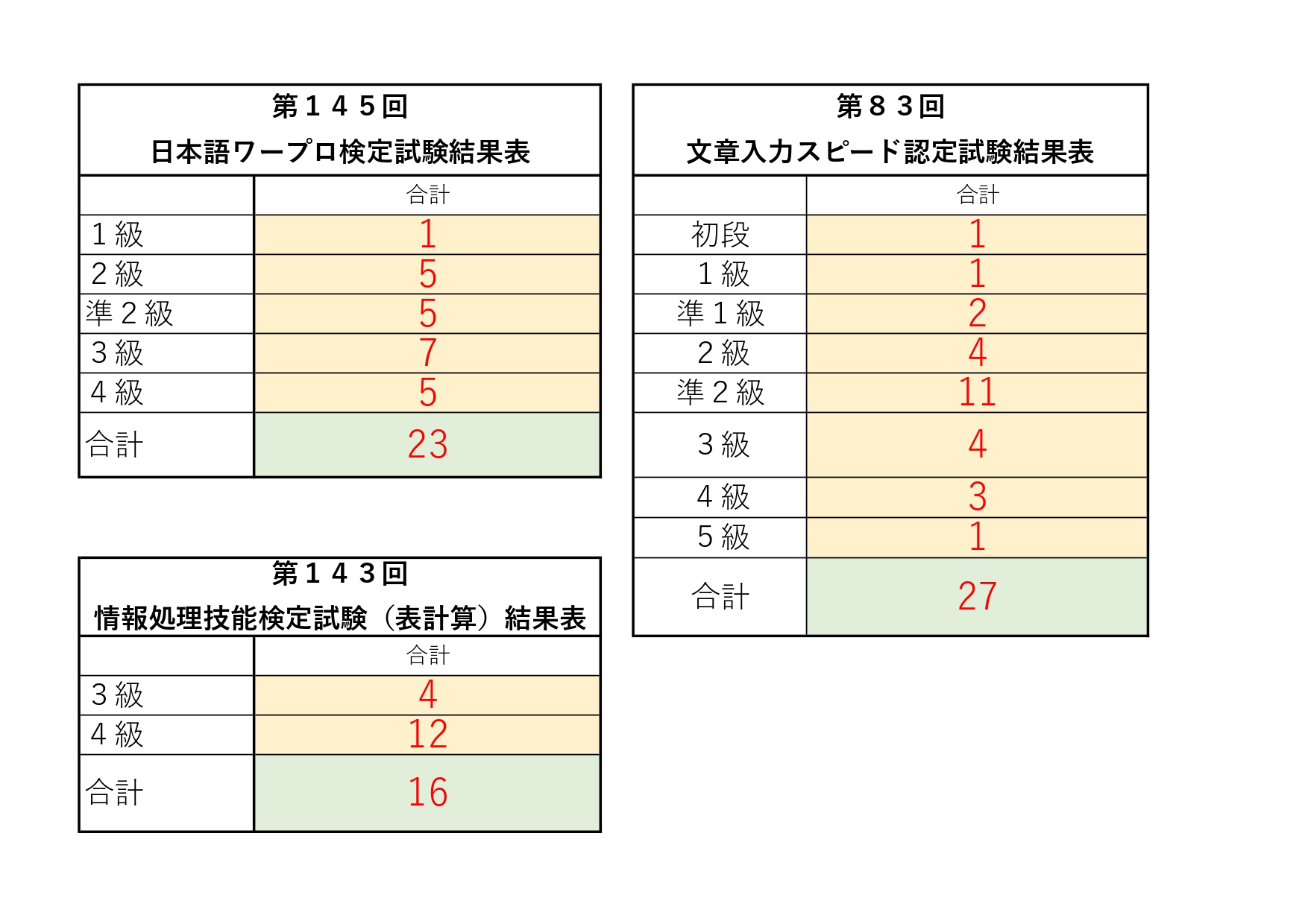 日本語ワープロ検定試験は2級が1名(3年)、合格することができました。